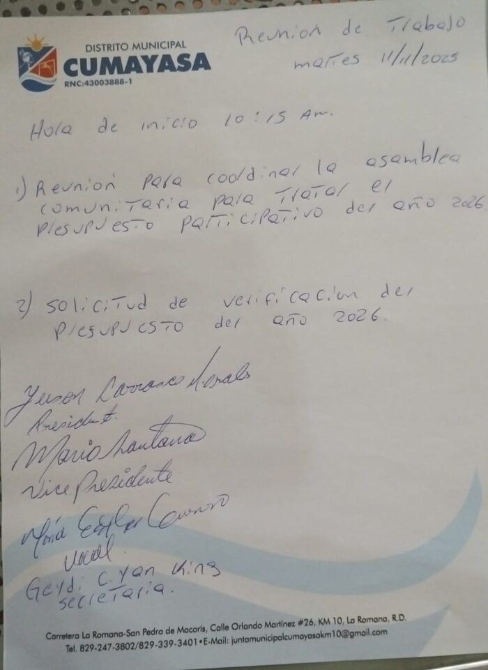 Cumayasa, La Romana – El Consejo de Regidores de la Junta del Distrito Municipal de Cumayasa celebró una importante reunión de trabajo el pasado martes 11 del mes en curso con el objetivo de coordinar la logística y detalles de la próxima Asamblea Comunitaria que se realizará en el distrito.